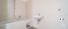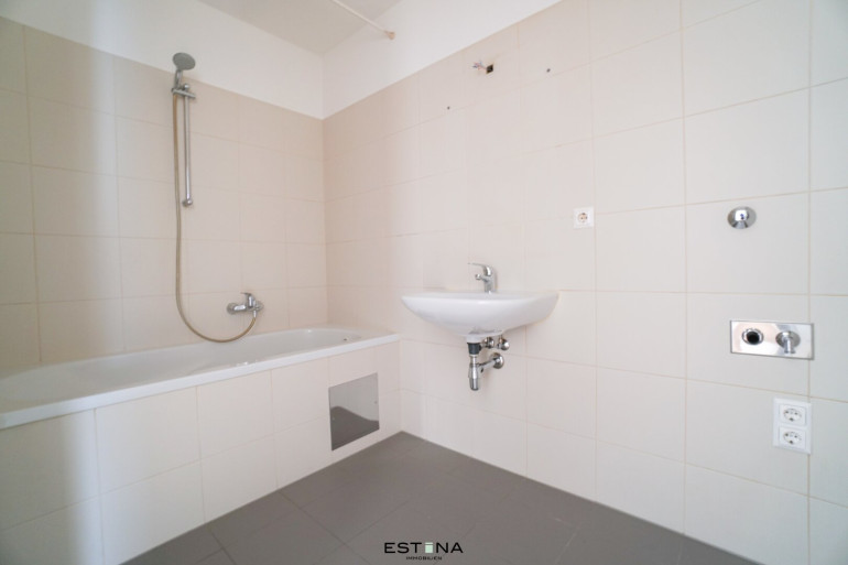 - Badezimmer mit Badewanne, Waschbecken und Waschmaschinenanschluss