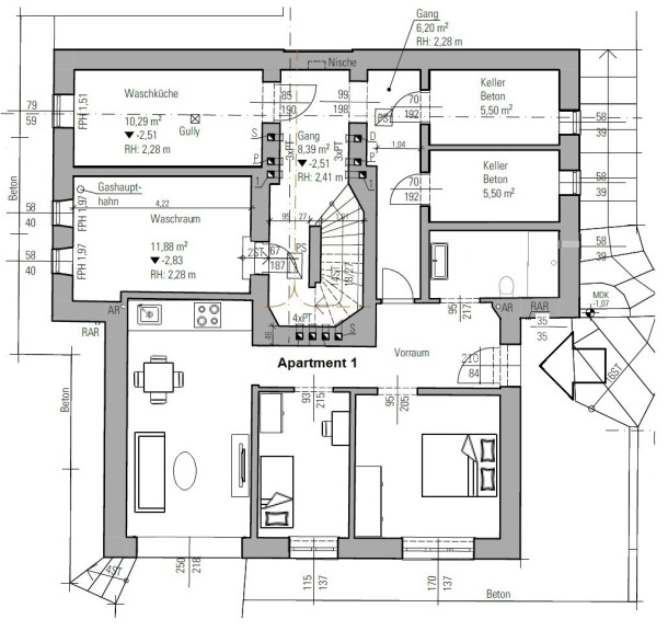Eine ca 55m² Wohnung im Untergeschoss mit Zugang zum Garten, eine ca 26m² Einzimmerwohnung und zwei ca. 45m² Wohnungen im ersten Stock wurden gerade saniert und möbliert, diese werden als Kurzzeitapartments via Booking.com und airbnb angeboten, sie wurden auch bei der Baubehörde als zur Apartmentwidmung eingereicht.