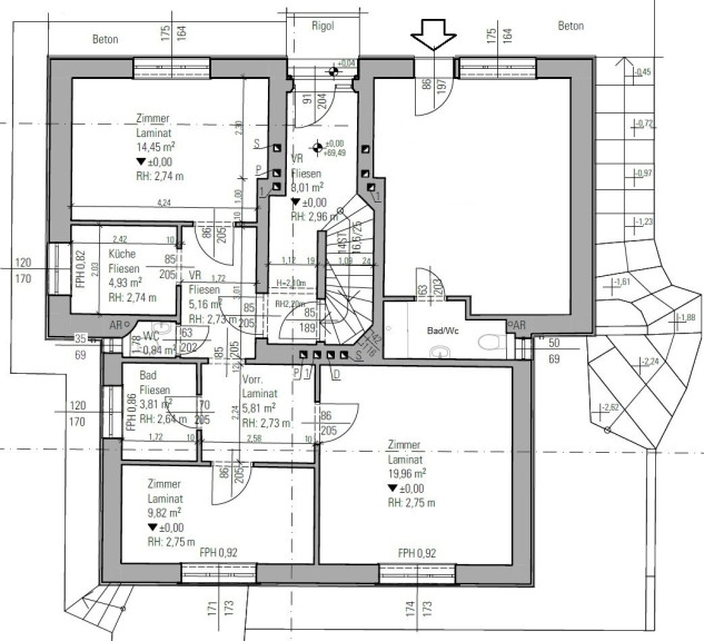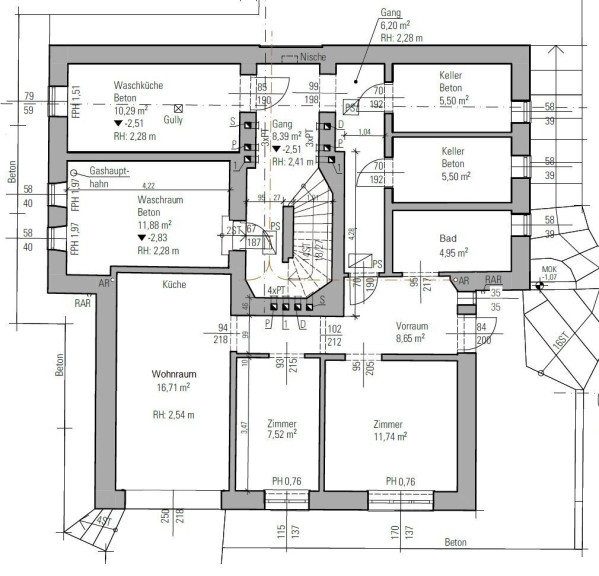 Raumaufteilung: Vorzimmer, 3 Zimmer, Küche, Badezimmer, WC, Kellerabteil; - Heizung Gasetagenheizung.