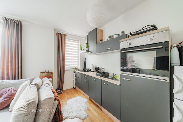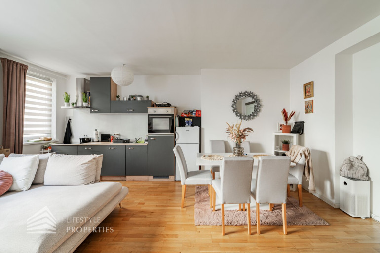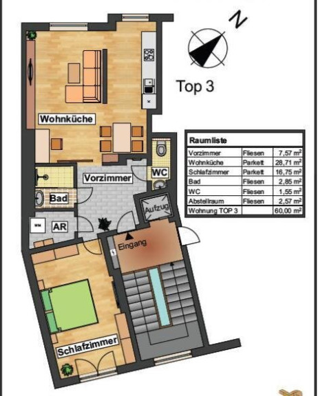 Die Wohnung liegt im 1. Liftstock eines gepflegten Neubaus und erstreckt sich über eine Wohnfläche von ca. 59 m². Sie teilt sich auf in einen Vorraum, eine Wohnküche, ein Schlafzimmer, ein Badezimmer, eine separate Toilette sowie einen Abstellraum. Die Haupträume sind mit schönem Parkett ausgekleidet, die Nassräume sind gefliest. Das Objekt wurde im Jahr 2019 generalsaniert und befindet sich in einem einwandfreien Zustand.