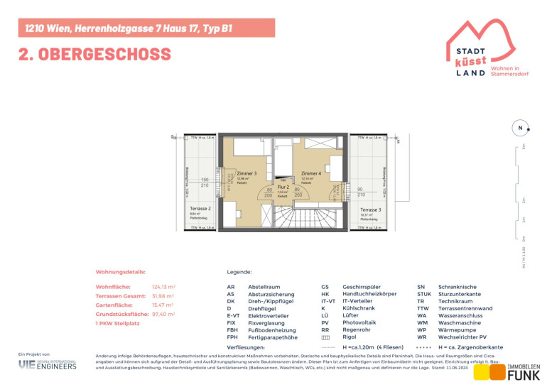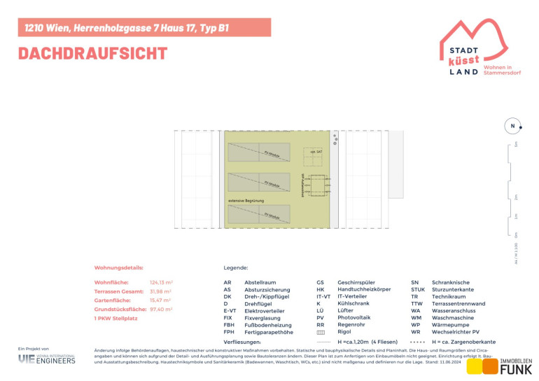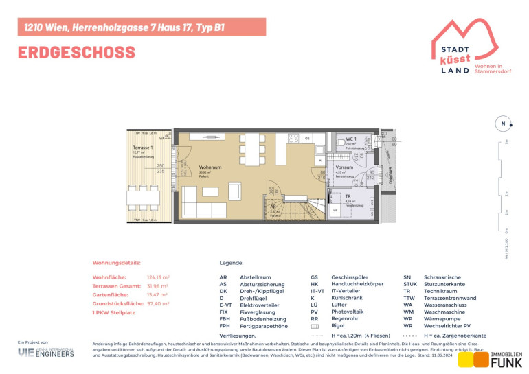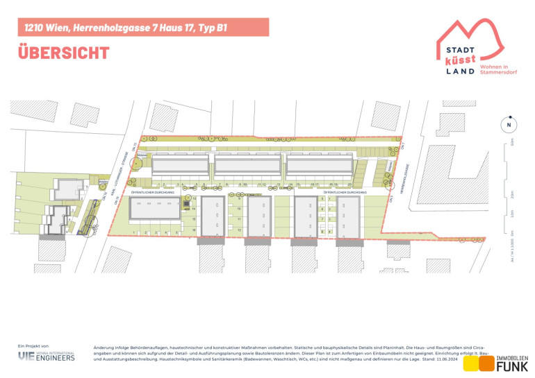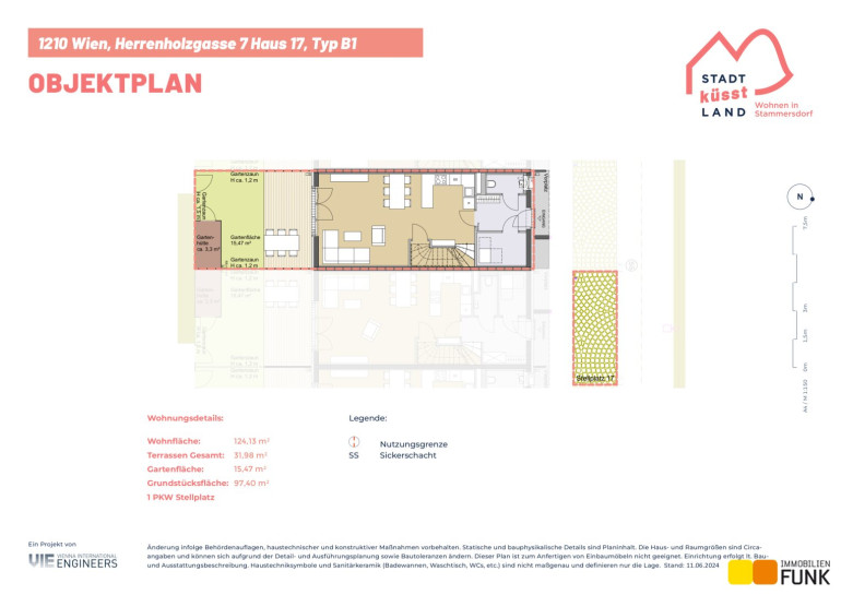 Das Reihenhaus 17 befindet sich in der Herrenholzgasse 7, 1210 Wien und wird auf einem ca. 97 m² großen Eigengrund errichtet. Seinen künftigen Bewohnern bietet es zudem eine komfortable Wohnfläche im Ausmaß von insgesamt ca. 124 m², angeordnet auf drei Geschoßen mit 5 Zimmern, 2 Toiletten, einem großen Badezimmer, dem Technikraum und einem Abstellraum, sowie einer südseitig ausgerichteten Terrasse mit ca. 12 m², die sich zu einem gemütlichen Gartenbereich mit ca. 15 m² öffnet. Im Dachgeschoß befinden sich zudem zwei Dachterrassen mit ca. 10 m² und 8 m². Diesem Reihenhaus ist ein Parkplatz direkt vor der Haustüre zugewiesen. Der Kaufpreis für den KFZ-Platz beträgt 19.000,00 € .