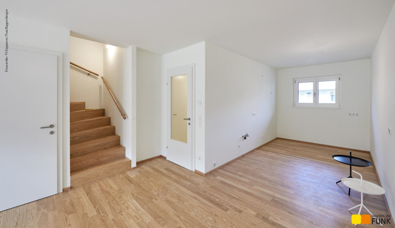 Vom überdachten Zugangsbereich der Liegenschaft betreten Sie den Vorraum (ca. 4,95 m²), der genügend Platz für eine Garderobe bietet. Linker Hand finden Sie den Haustechnikraum (ca. 4,59 m²) samt hauseigener Wärmepumpe. Rechter Hand ist die natürlich belichtete Toilette (ca. 2,02 m²) mit Handwaschbecken geplant. Weiter geradeaus gelangen Sie direkt in die offen konzipierte Wohnküche (ca. 35,92 m²), wobei Sie linker Hand eine Innentreppe in die oberen zwei Geschoße führt. Der Bereich unterhalb der Stiege ist im Erdgeschoß als Abstellraum (ca. 3,52 m²) geplant. Von der ansprechenden Wohnküche gelangen Sie zur südseitig ausgerichteten Terrasse (ca. 12,77 m²) und einem gemütlichen Garten (15,47 m²) mit eigener Gartenhütte.