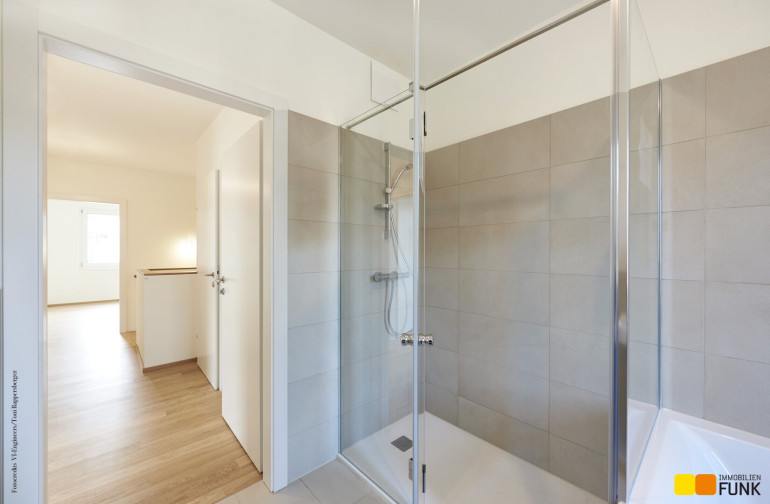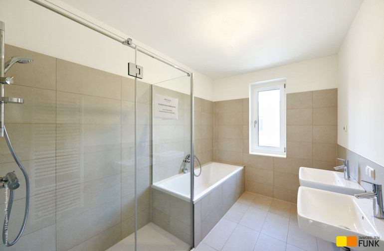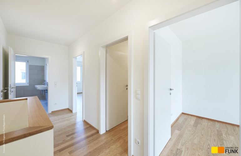 Im 01. Obergeschoß erschließt der zentral angelegte Flur (ca. 6,22 m²) zwei großzügige Schlafzimmer. Eines davon ist als Master-Bedroom (ca. 16,98 m²) mit Platz für einen großen Schrank geplant. Das andere Schlafzimmer weist eine Fläche von ca. 12,44 m² auf. Ein geräumiges Badezimmer (ca. 8,11 m²) mit Badewanne und Dusche, einem Doppelwaschtisch, einem Handtuchheizkörper, sowie einem Waschmaschinenanschluss finden Sie ebenso wie ein separates WC (ca. 2,69 m²) mit Handwaschbecken. Die Innenstiege führt Sie vom Flur aus in das lichtdurchflutete Dachgeschoß, das zwei weitere Schlafräume mit eigenen Dachterrassen bietet.