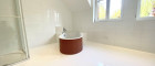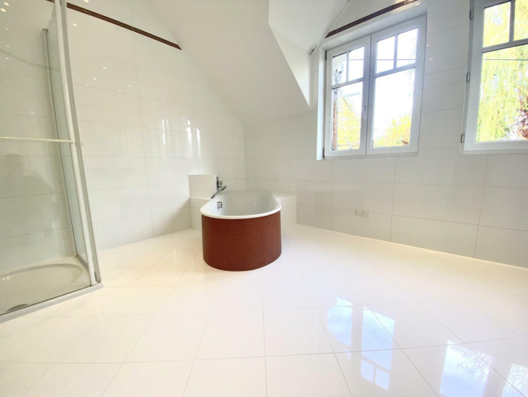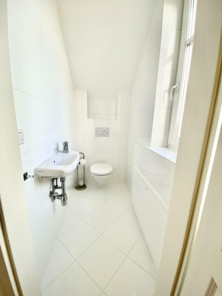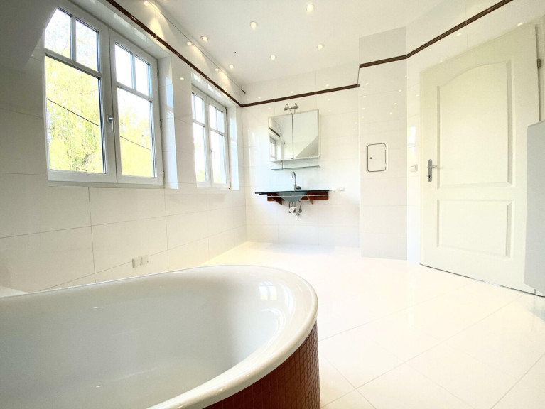 Im Obergeschoss befinden sich 2 großzügige Schlafzimmer, ein großes Bad und ein WC. Das Bad ist mit Dusche samt Glastrennwand, freistehender Wanne, Glaswaschtisch samt Ablage und Oberkastel, großes Sidebord für Handtücher ausgestattet. Das Bad und die WC`s sind weiß gefliest (Großformat) und haben einen hellen Feinsteinzeugboden (WC im EG Granitboden).