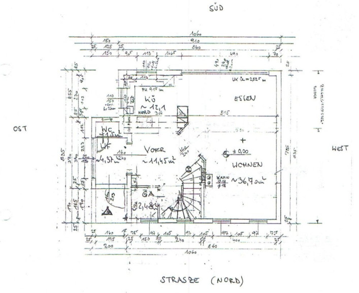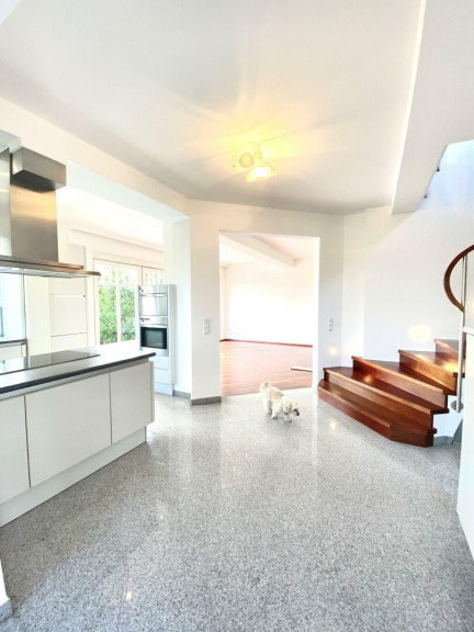 Im Erdgeschoss des Hauses befindet sich eine offene Wohnküche mit einer davor befindlichen gartenseitigen Terrasse.Die Küche der Marke Simatic wurde mit Miele-Geräten (Backrohr, Dampfgarer, Kühlschrank, Geschirrspüler, Cerankochplatte, Brotschneider,...) ausgestattet, weiters sind Garderobe, Gäste-WC und Eingangsbereich vorhanden. Im Wohnbereich wurde Parkett verlegt in den anderen Räumen ist Granitboden vorhanden. Das Haus wurde mit Rolläden ausgestattet.
