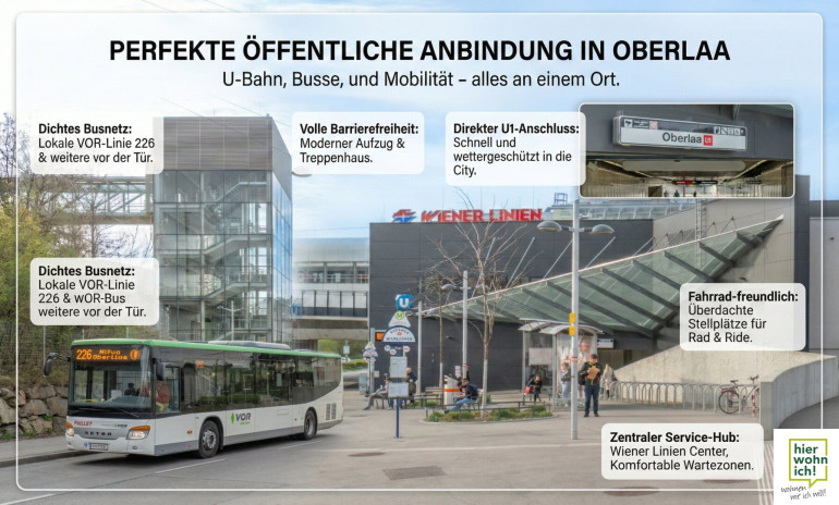 Die Wohnung befindet sich in einer tollen und grünen Lage beim Liesingbach und ist öffentlich sehr gut angebunden. Die nächste Bushaltestelle (Linie 17A / 70A) ist nur wenige Gehminuten entfernt und bringt Sie direkt zur U-Bahn-Station Oberlaa (U1) oder zum Bahnhof Kledering. So sind Sie schnell und unkompliziert in der Innenstadt.