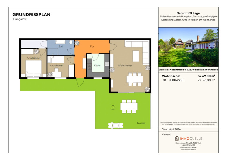 In der Mozartstraße, nahe dem wunderschönen Kärntner Wörthersee, wartet mit dieser Liegenschaft ein einzigartiges Grundstück voller Potenzial und Gestaltungsspielraum auf einen wertschätzenden Eigentümer. Auf einer Grundstücksfläche von 1.016 m² befindet sich nicht nur ein schmuckes Holzhaus mit traditionellen Kastenfenstern, sondern auch ein ansprechender Bungalow und ein geräumiges Gartenhaus.