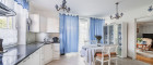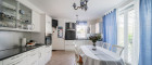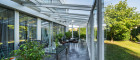 Zurück im Flur befindet sich linkerhand das großzügige Esszimmer mit direktem Zugang zur hellen Küche, sowie zum knapp 30 m2 großen und beheizbaren Wintergarten. Neben der Küche befindet sich der Vorratsraum, welcher ebenso der zweite Eingang ist. Gegenüber vom Eingangsbereich befindet sich ein Arbeitszimmer und ein Gäste-WC mit Handwaschbecken.