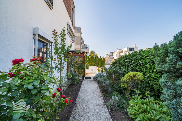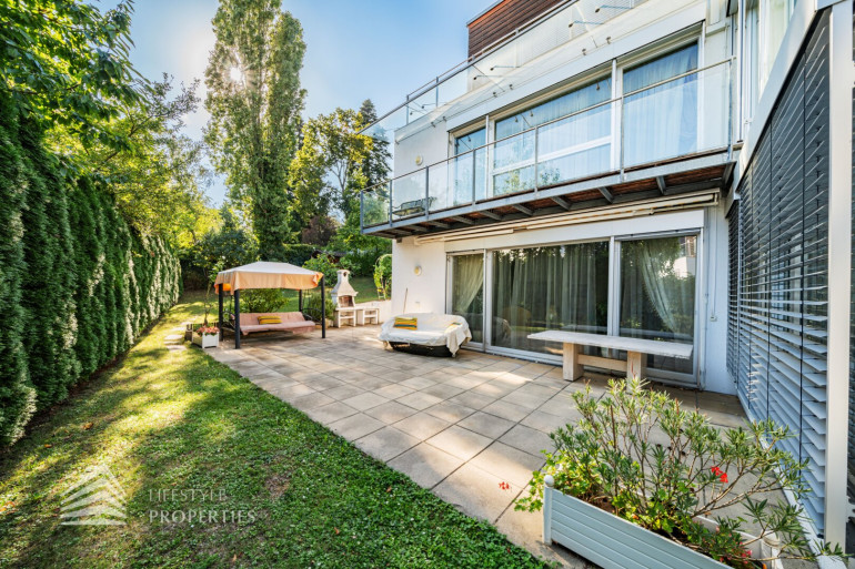 Beim Betreten der Villa über den Haupteingang gelangen Sie in einen einladenden Flur, dieser führt zentral in die Räumlichkeiten des Erdgeschoßes. Rechterhand kommen Sie in das knapp 50 m2 geräumige und lichtdurchflutete Wohnzimmer, welches mit einem funktionierenden Kamin ausgestattet ist. Durch die großen Glastüren gelangen Sie in den Garten, sowie auf die ca. 33 m2 große Terrasse, welche mit einem einladenden Grillplatz überzeugt und viel Platz für Sitzgelegenheiten bietet. Weiters gibt es mehrere Obstbäume wie Apfel-, Birnen- und Feigenbäume, sowie einen Magnolienbaum und wunderbare Sträucher, die auch als Sichtschutz dienen.