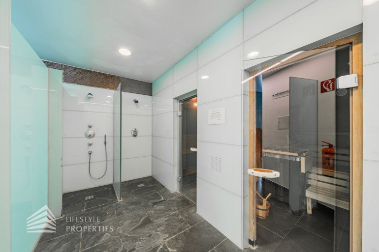 Eine weitere Etage tiefer haben Sie 2 große Kellerabteile, die als Lager genutzt werden können und sich auch ideal als Weinlager anbieten. Ebenso ist hier auch der direkte Sicherheitszugang zu der Garage, welcher Sie zu den drei PKW Stellplätzen führt. Über die Garage gelangen Sie zu den weiteren Einrichtungen der Gebäudeanlage. Hier befindet sich ein Fitnessraum und ein Wellnessbereich, mit Schwimmbecken, einer Massageliege, Sauna, Dampfbad und Umkleiden mit Spinden. Auf die Pflege der Anlage legt die Hausverwaltung viel wert, ebenso auf die Hygienestandards im und am Pool.