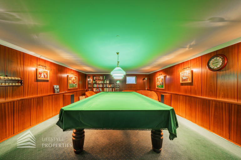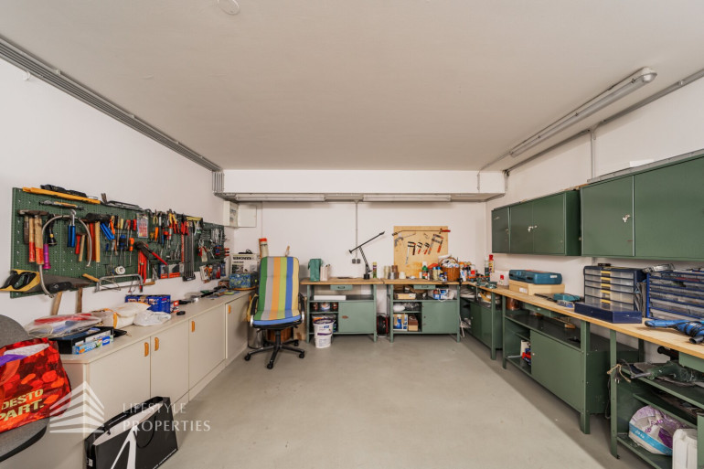 Mit dem Lift, aber auch über die Treppe, gelangen Sie in das 1. Untergeschoß. Hier finden Sie linkerhand einen ca. 42 m2 großen Fitnessraum, der durch eine Spiegelwand und eine Ballettstange hervorsticht. Ebenso ist hier Platz für eine Sitzecke, die zum Verweilen mit Freunden einlädt. Direkt anschließend gelangen Sie zu der hauseigenen Sauna mit Dusche und WC. Rechterhand vom Lift finden Sie einen Billardraum, mit einem original russischen Billardtisch aus Marmor. Dieser Raum besticht durch hochwertiges Kirschholz an den Wänden. Weiteres befindet sich in dieser Etage auch ein Werkraum, der das Heimwerkerherz höher schlagen lässt. Außerdem befindet sich hier auch eine Toilette mit separatem Handwaschbecken.