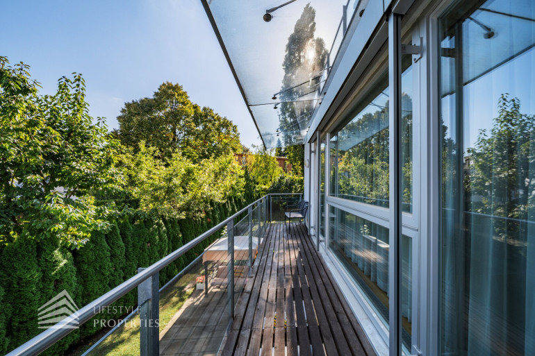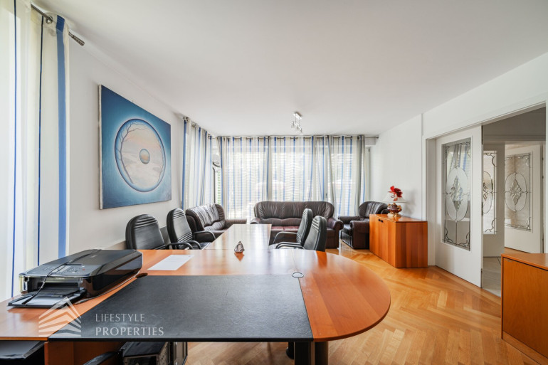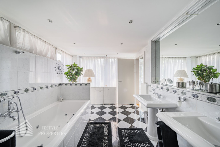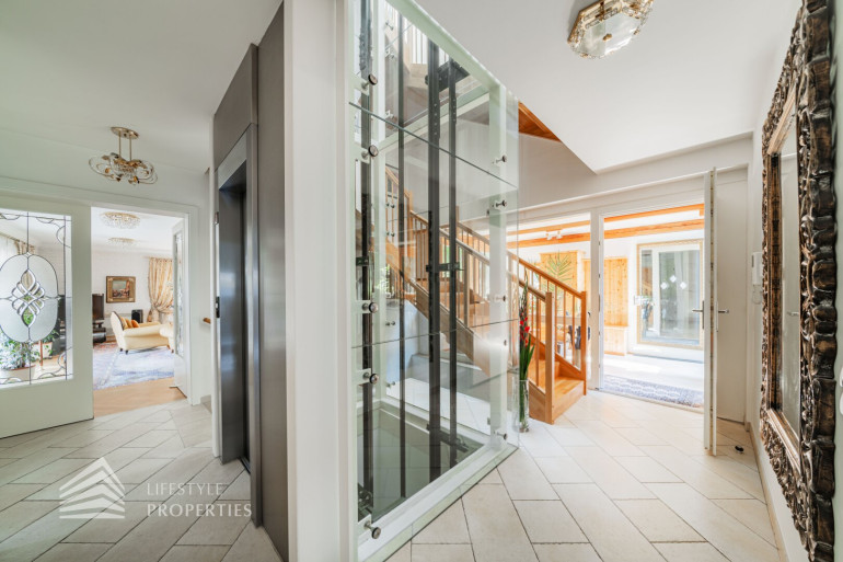Das Objekt befindet sich auf einem knapp 700 m2 großen Grundstück und überzeugt mit einer Wohnfläche von ca. 420 m2 und einer unglaublichen Gesamtnutzfläche von ca. 645 m². Sie erstreckt sich über 1 Erd-, 2 Ober- und 2 Untergeschosse und teilt sich in 6 Schlafzimmer, 4 Badezimmer, Ankleideräume, ein Wohnzimmer, sowie ein Esszimmer, eine Küche, ein Arbeitszimmer/Bibiliothek, einen Wintergarten, einen Billardraum und einen Fitnessraum mit Sauna auf. Ebenso verfügt die Immobilie über 3 PKW Stellplätze in der Garage, die über das 2. Untergeschoß direkt angebunden ist. Jede Etage ist mit dem hauseigenen Lift und einer wunderschönen Holztreppe zu erreichen. Die Immobilie ist Teil einer Gebäudeanlage, die über weitere Einrichtungen zur freien Nutzung verfügt. Einerseits haben Sie Zugang zu einem weiteren Fitnessraum, aber auch zu einem Indoor Schwimmbecken mit Sauna und Dampfbad, sowie zu einem einladenden Außenbereich, der zum Verweilen einlädt. Die gesamte Immobilie verfügt über eine Alarmanlage und elektrische Außenjalousie. Alle Nassräume, der Flur und die Küche sind mit hochwertigen Fliesen ausgestattet. In diesen Räumlichkeiten haben Sie überall Fußbodenheizung. Alle weiteren Räume sind mit wunderschönem Fischgrätenparkett ausgestattet. In den meisten Räumlichkeiten befinden sich außerdem Klimageräte.