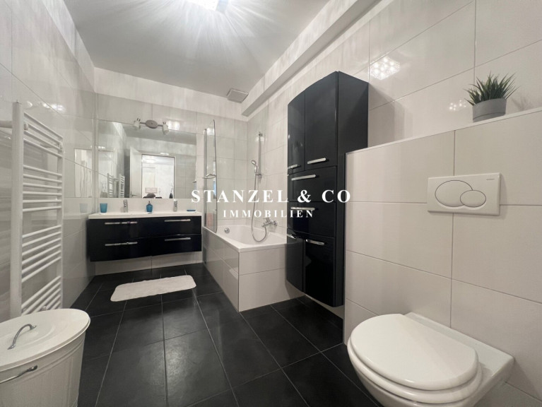 Die beiden weiteren Schlafzimmer sind je 20m² groß und ebenso südwestseitig ausgerichtet. Das zweite Badezimmer ist mit einer Wanne, einem Doppelwaschtisch, Spiegel, WC und Handtuchtrockner ausgestattet.