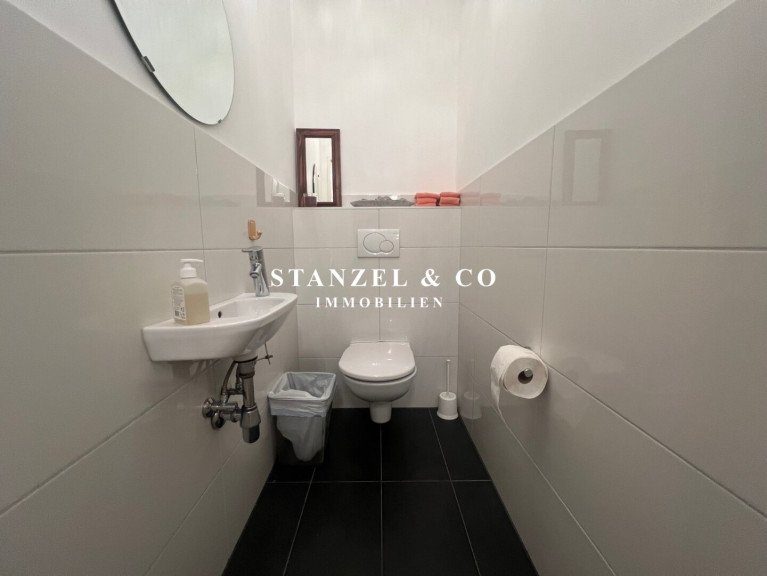 Des Weiteren gibt es einen 5m² großen Wirtschaftsraum mit Waschmaschinenanschluss sowie ein Gäste-WC mit Handwaschbecken und elektrischer Entlüftung.
