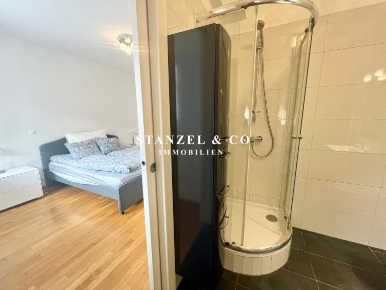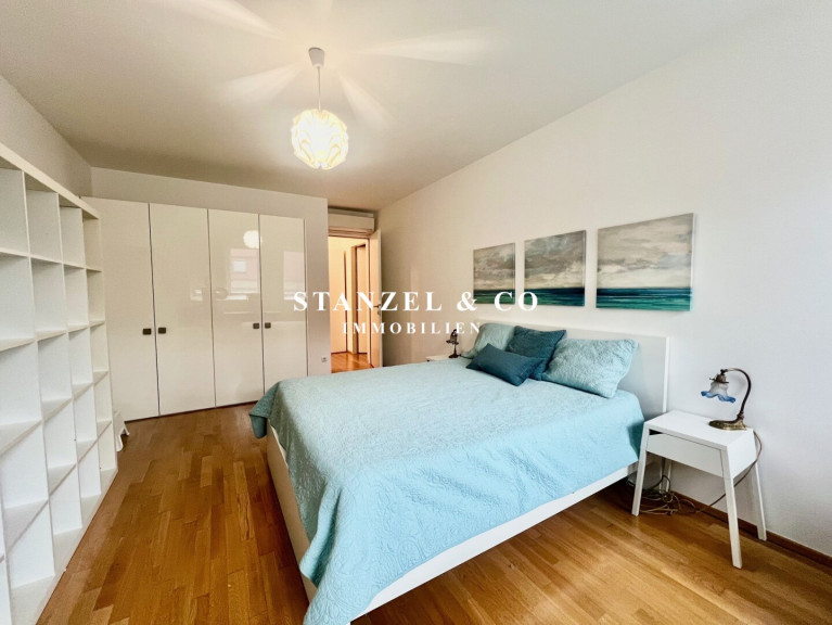 Die 3 Schlafzimmer sind zentral vom Vorzimmer aus zu begehen und südwestseitig orientiert. Das 18m² große Schlafzimmer ist durch eine Schiebetüre mit dem anschließenden Badezimmer mit Fenster, Dusche, Bidet, Waschbecken, Handtuchtrockner und Spiegel verbunden.