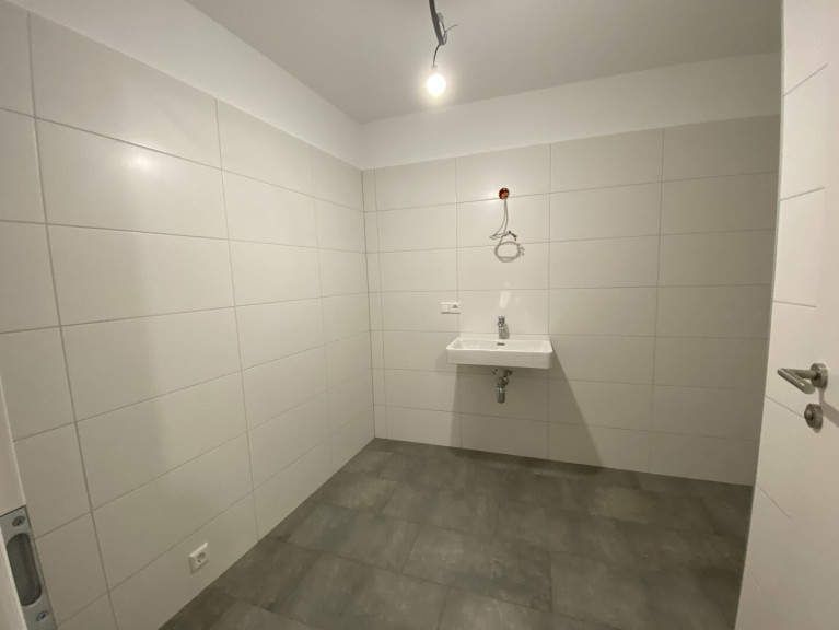 - Badezimmer mit begehbarer Dusche, Waschtisch und Waschmaschinenanschluss
