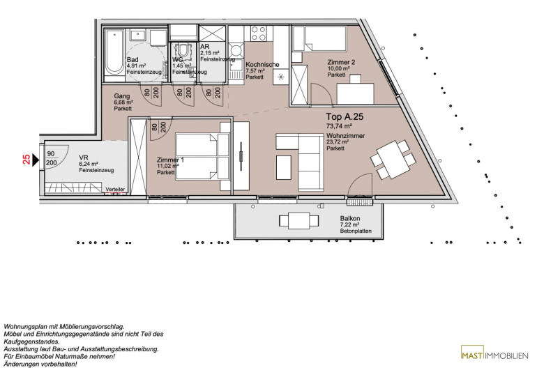 Die Wohnung befindet sich im 4. Liftstock und verfügt über 73,74 m² Wohnfläche + einen 7,22 m² großen Balkon.