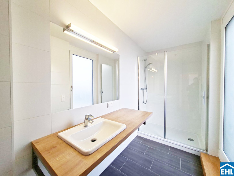- Badezimmer mit Dusche, WC, Waschmaschinenanschluss