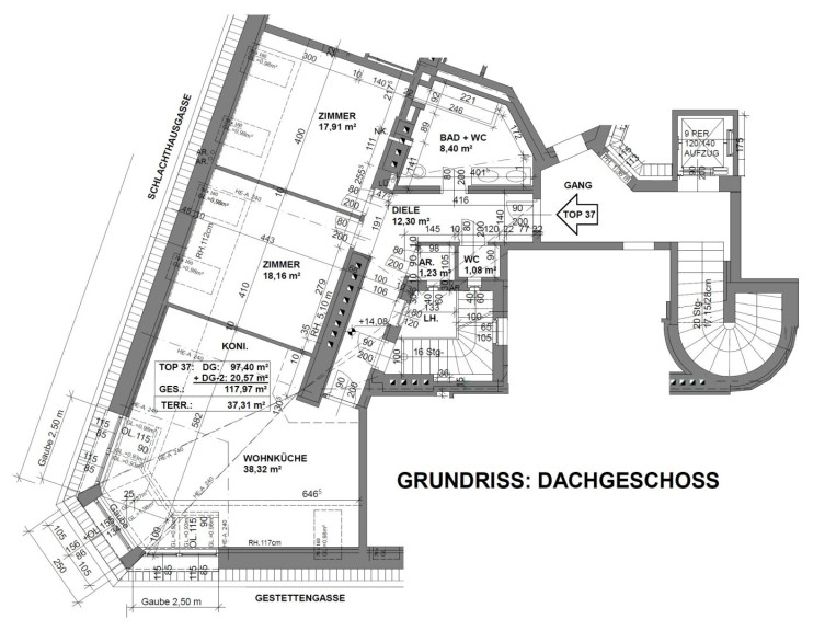 Fläche UG: 97,40m² - Fläche OG: 20,57m²(Abstellfläche) - Dachterrasse: 37,31m² (1/3)