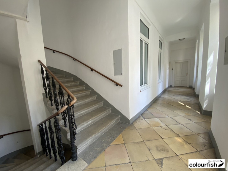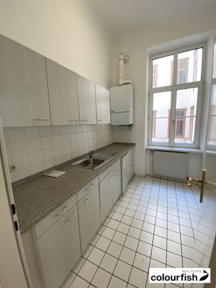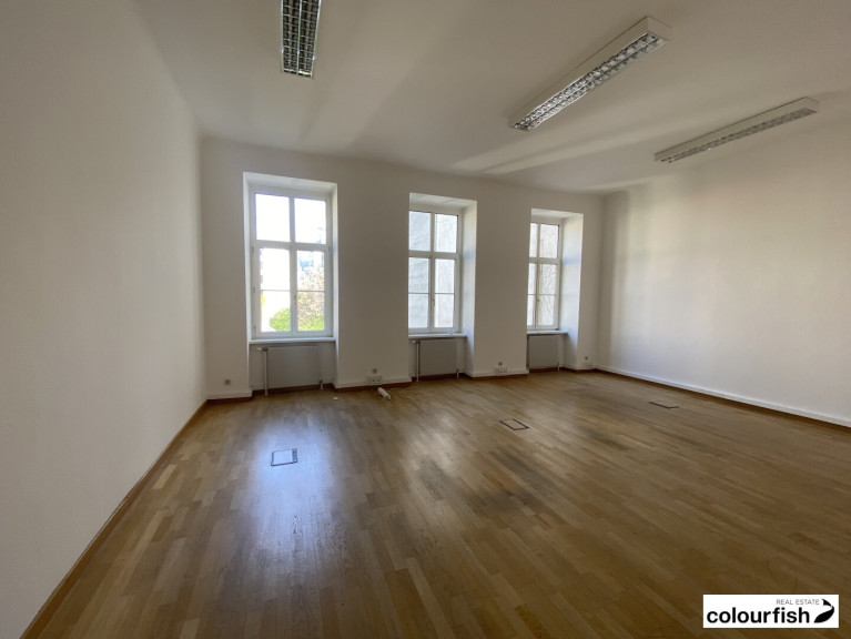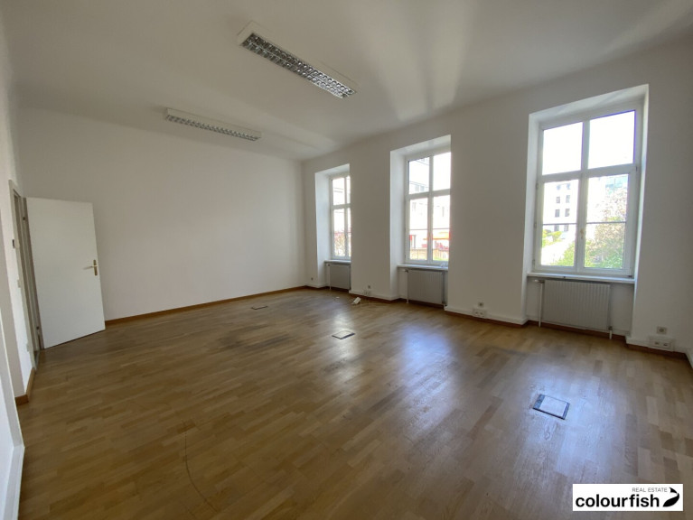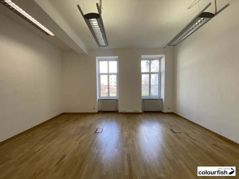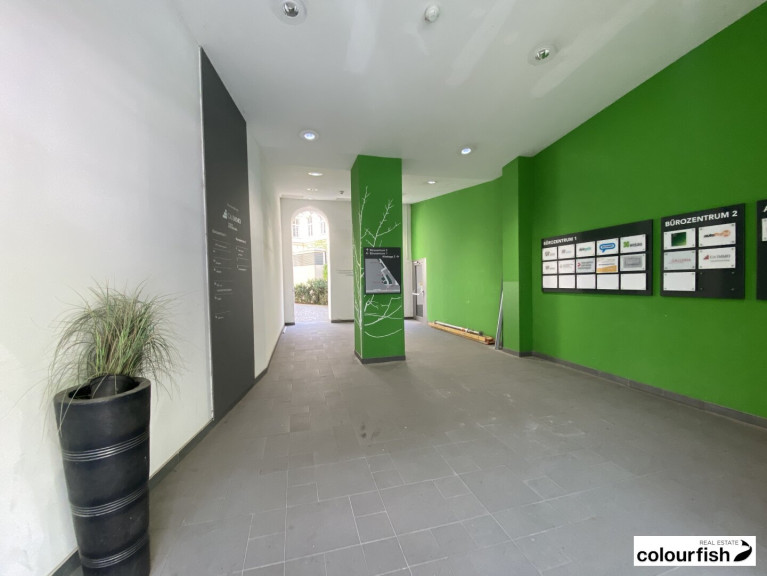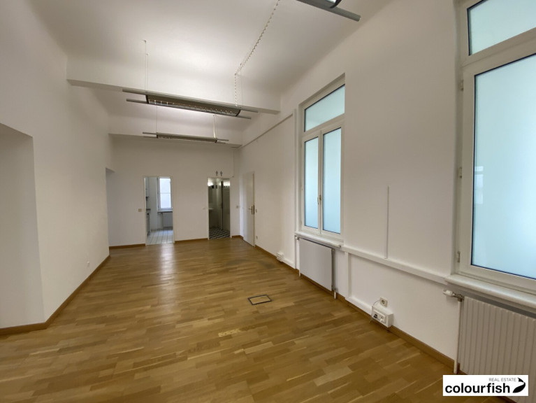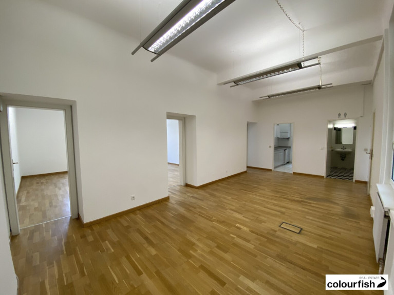 Der aktuelle Grundriss gliedert sich in zwei große Büroräume, und einen großzügigen Empfangsbereich, Teeküche und getrennte Sanitäreinheiten. Eine Sanierung der Oberflächen ist in Absprache mit dem Mieter vor Übergabe möglich. Das Büro ist über einem Aufzug und wenige Stufen erreichbar.
