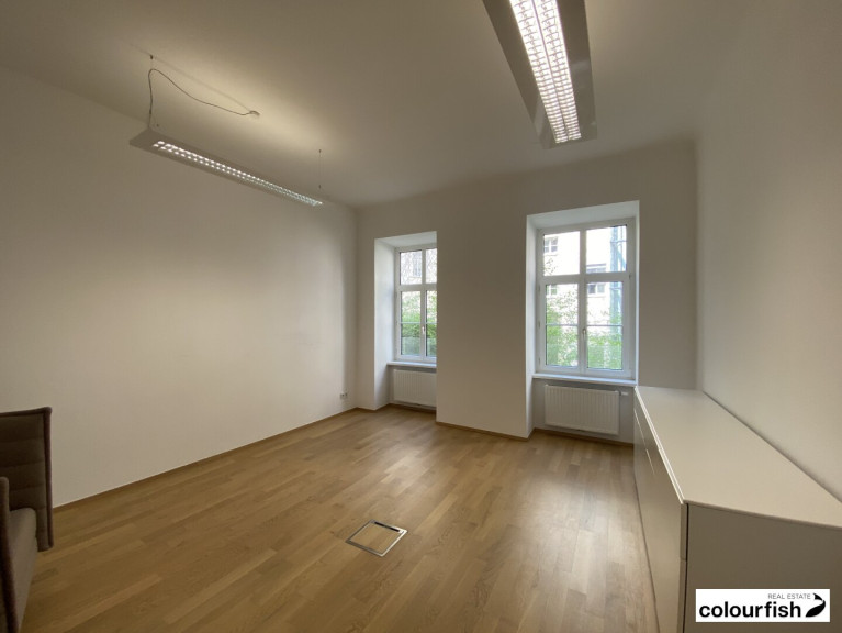 Die Fläche befindet sich im Zwischengeschoß (ohne Lift) und teilt sich auf in Vorraum, drei Bürozimmer, Teeküche und eine Sanitäreinheit.