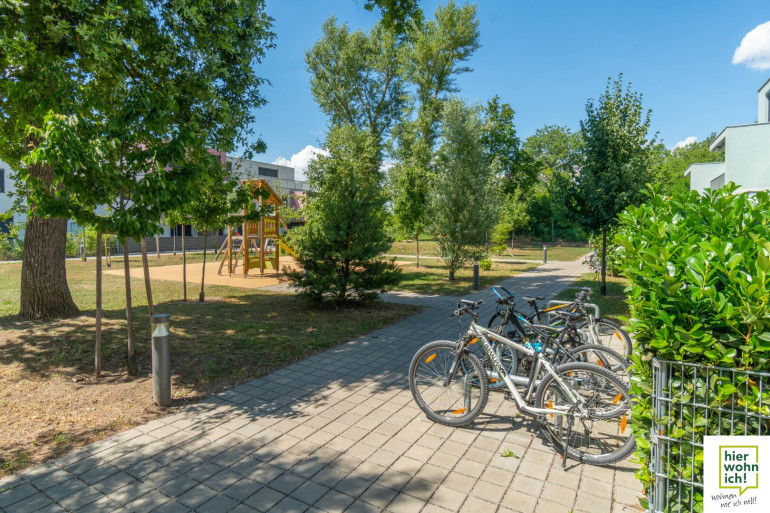 Fahrradräume sind im Kellergeschoss, Kinderwagenräume im Erdgeschoss verfügbar. Die Anlage hat auch einen großen Kinderspielplatz.