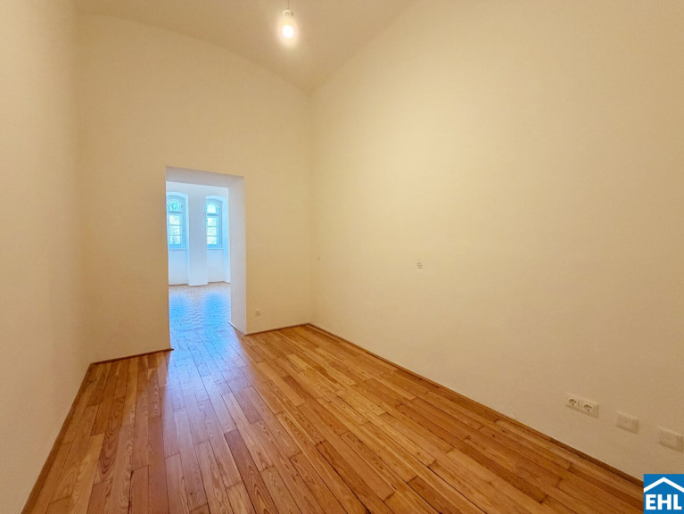 - Wohnräume: Parkettboden, Sanitärräume: Fliesen