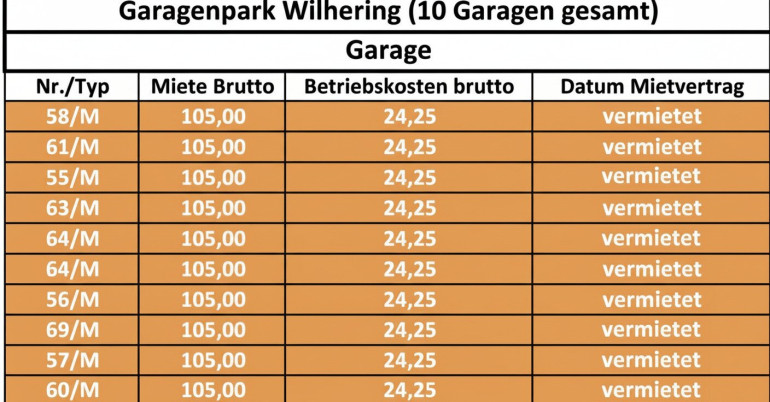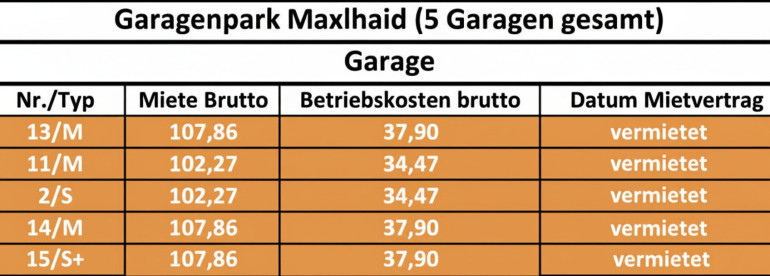 Betriebskosten p.M ca. € 24,30 (brutto) pro Garage