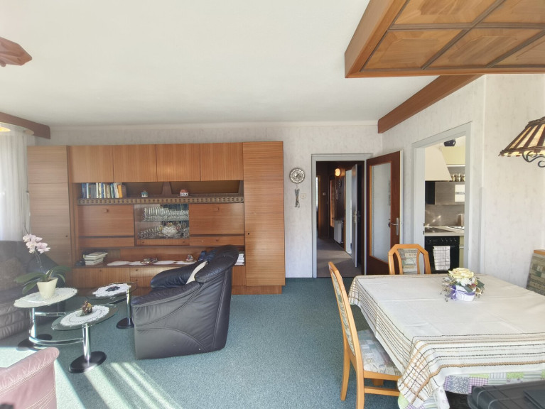Offener Wohn-Essbereich mit direktem Zugang zum Balkon und traumhafter Aussicht