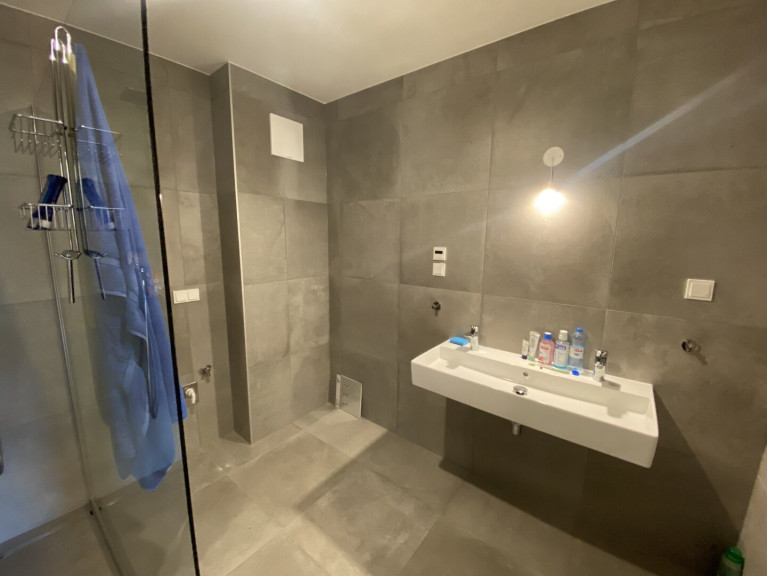 Das Bad ist mit einer bodenebenen Dusche ausgestattet, um Ihre tägliche Routine zu einem entspannten Erlebnis zu machen.