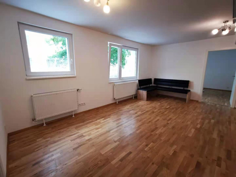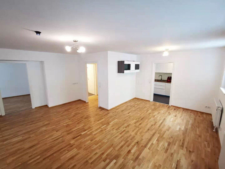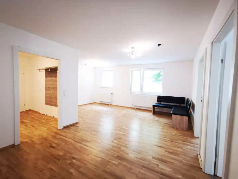 Zum Verkaufen gelangt schöne 4-Zimmer Wohnung im 21. Bezirk in Wien. Das Wohnzimmer ist um Ecke mit sehr guter Beleuchtung.