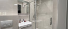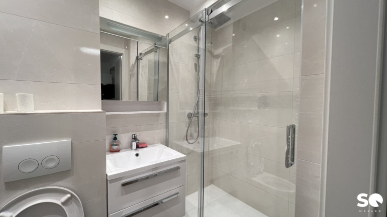 Badezimmer: Das frisch sanierte Badezimmer verfügt über eine komfortable Dusche und ein elegantes Handwaschbecken sowie ein WC. Modernes Design trifft auf praktische Nutzung.