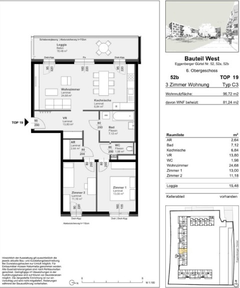 Diese elegant geschnittene 3 Zimmerwohnung mit ca. 81,24 m² befindet sich im 6. Obergeschoss mit Lift und vereint stillvolles Wohnen mit urbanem Komfort.Die Wohnung gliedert sich in folgende Räumlichkeiten: