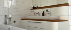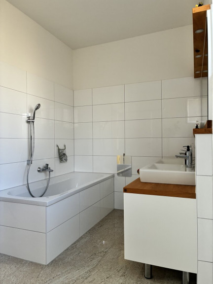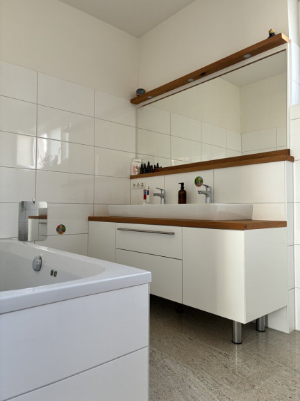 - großes Badezimmer mit Dusche, Badewanne, WC, 2 Waschbecken (ausgestattet mit Tischlermöbel)
