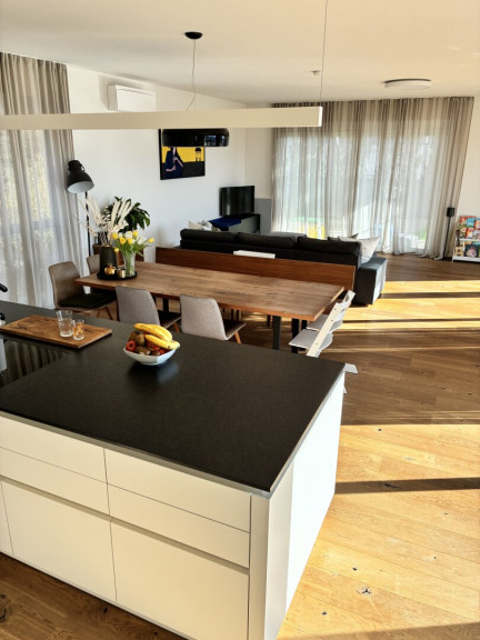 - großer Wohnraum mit moderner Tischlerküche und direktem Zugang zur Terrasse