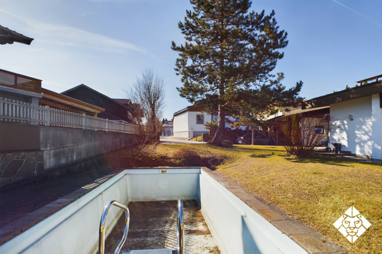 - Pool im Südwesten des Grundstücks, eingebettet unter einem alten Kieferbaum
