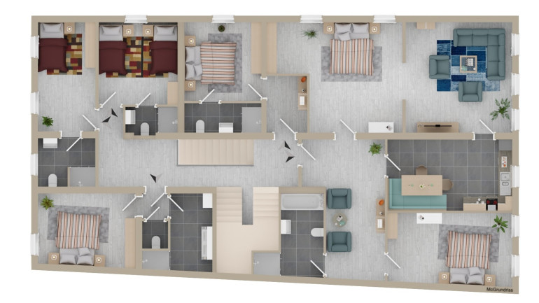 1.OG: - Zimmer von ca.12m² bis ca. 20m² - Bäder von ca. 3m² bis ca. 10m² - Abstellraum ca. 9m² - Gang ca. 26m²