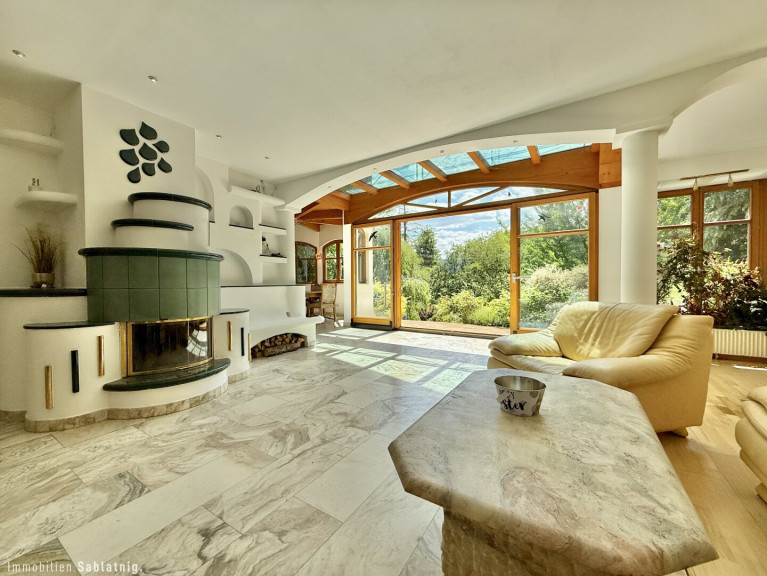 - Wohnzimmer mit Kamin und direktem Terrassenzugang