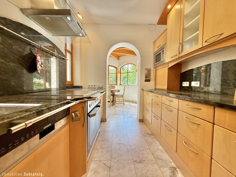 Parkett, Fliesen, Steinboden, Gas, Fußbodenheizung, Kamin, Einbauküche, Südbalkon, Bad mit Fenster, Badewanne, Dusche, Parkplatz, Garage, Alarmanlage, Sauna, Swimmingpool, Teeküche