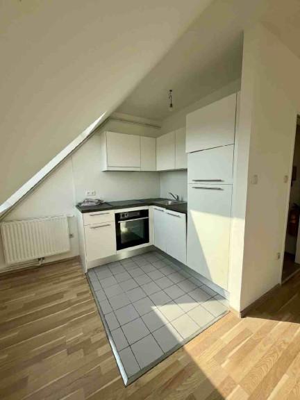 Im Dachgeschoss steht eine 2 Zimmer Wohnung mit einer Bruttomiete von € 995,00 Euro zur Verfügung. Sie bietet eine kleine, hochwertige Küche mit Markengeräten, darunter ein Siemens Geschirrspüler, sowie ein Badezimmer mit Wanne. Die vorhandenen Dachschrägen schaffen ein gemütliches Wohnambiente und richten sich an Personen, die diesen Wohnstil bewusst bevorzugen.