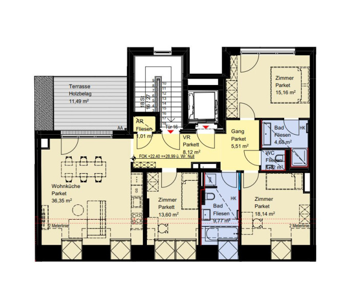 Parkett, Estrichboden, Fliesen, Fußbodenheizung, Personenaufzug, Westbalkon, Badewanne, Dusche