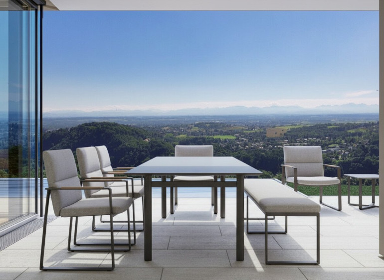 Die Architektur erzählt eine stille Geschichte – von Klarheit und Beständigkeit. Helle, natürliche Materialen treffen auf fein strukturierten Putz, großzügige Glasflächen öffnen sich zur Natur und lassen Licht zu einem zentralen Gestaltungselement werden. Die Gebäudevolumen fügen sich harmonisch in das sanft abfallende Gelände ein – nicht aufgesetzt, sondern eingebettet. Organisch. Selbstverständlich.