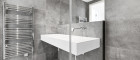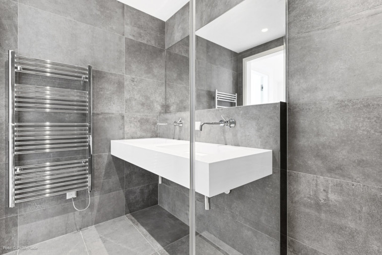 - Exquisite Sanitärausstattung mit großformatigem Feinsteinzeug in Dusche und WC