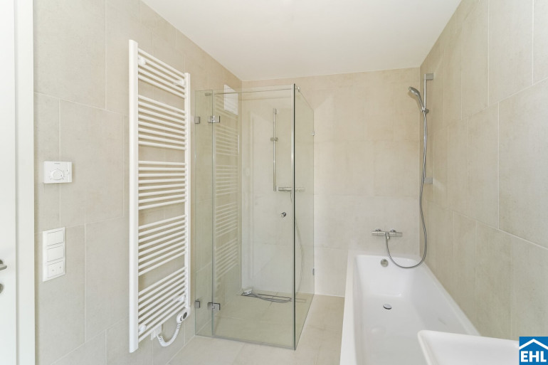 Die Liegenschaft vereint nicht nur architektonische Eleganz, sondern setzt auch in puncto Ausstattung auf höchste Standards. Große Fenster mit Dreifachverglasung lassen viel Licht in die Wohnungen und sorgen für eine angenehme Wohnatmosphäre. Raffstores bieten flexiblen Sonnenschutz und Privatsphäre. In den Wohnräumen sorgen edle Parkettböden für eine warme, wohnliche Atmosphäre, während die Bäder mit großformatigen Feinsteinzeugfliesen modern und stilvoll gestaltet sind.