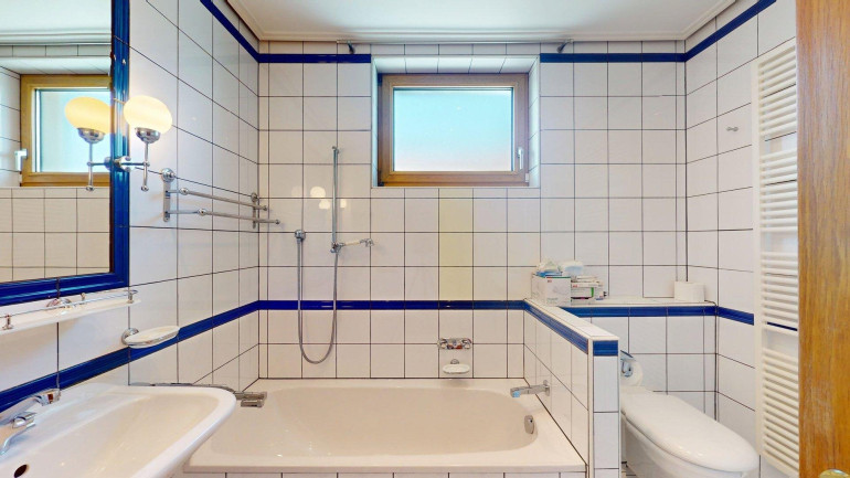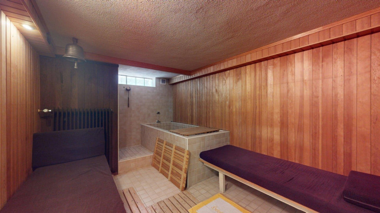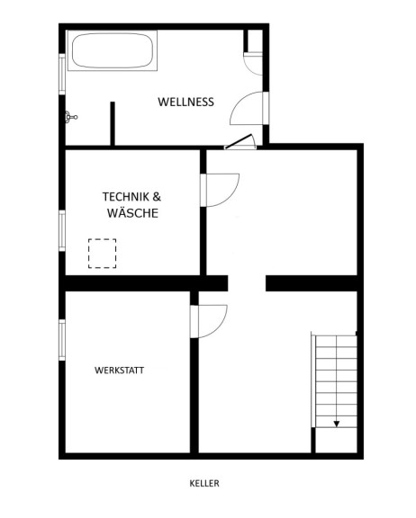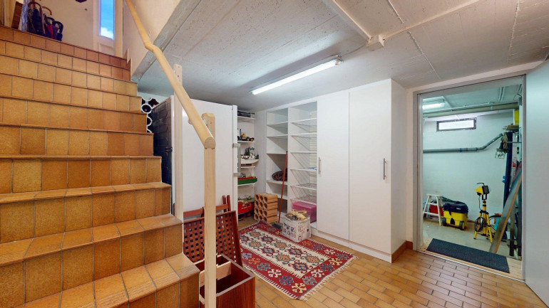 - Keller (ca. 63m²): Der Keller bietet neben zusätzlichen Abstellmöglichkeiten auch Platz für für einen Wellnessbereich (aktuell mit Sauna) und eine Werkstatt.