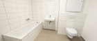 Das Badezimmer ist modern verfliest und mit einer Badewanne ausgestattet. Des Weiteren befinden sich ein Handwaschbecken, ein WC und ein Waschmaschinenanschluss im Badezimmer.
