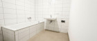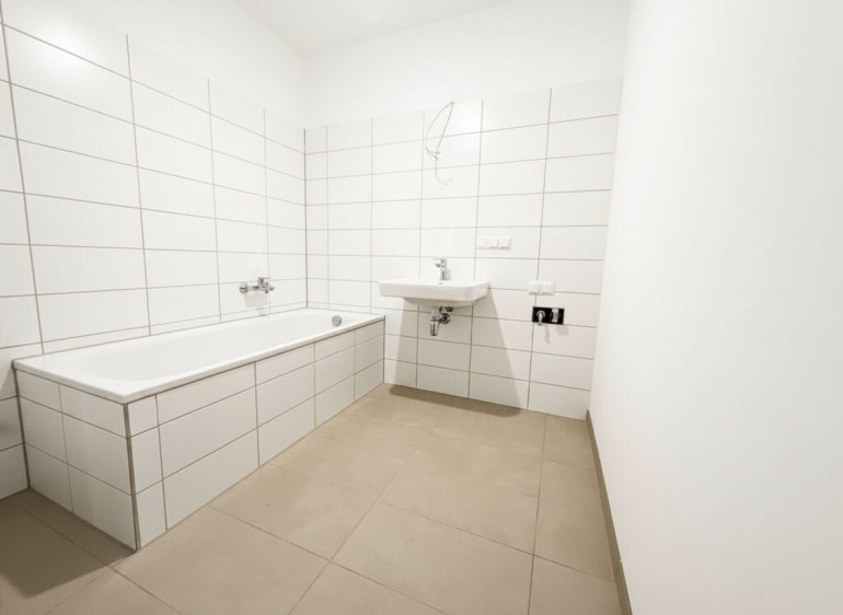 Das Badezimmer ist modern verfliest und mit einer Badewanne ausgestattet. Des Weiteren befinden sich ein Handwaschbecken und ein Waschmaschinenanschluss im Badezimmer. Das WC ist ebenfalls modern verfliest und separat, neben dem Badezimmer vorzufinden.