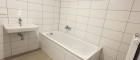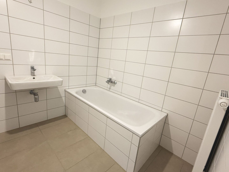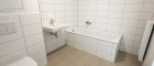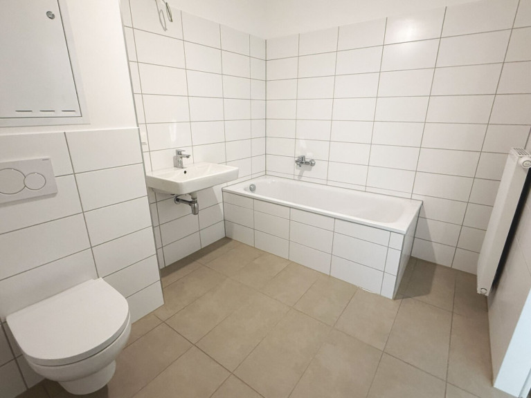 Das Badezimmer ist modern verfliest und mit einer Badewanne ausgestattet. Des Weiteren befinden sich ein Handwaschbecken, ein WC und ein Waschmaschinenanschluss im Badezimmer.