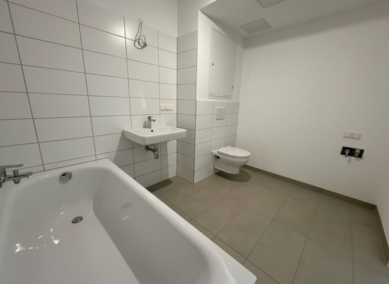 Das Badezimmer ist modern verfliest und mit einer Badewanne ausgestattet. Des Weiteren befinden sich ein Handwaschbecken, ein WC und ein Waschmaschinenanschluss im Badezimmer.