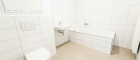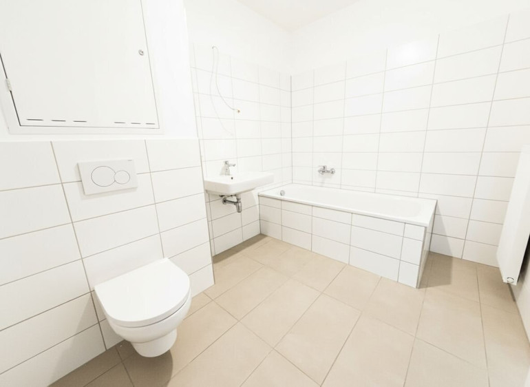 Das Badezimmer ist modern verfliest und mit einer Badewanne ausgestattet. Des Weiteren befinden sich ein Handwaschbecken, ein WC und ein Waschmaschinenanschluss im Badezimmer.